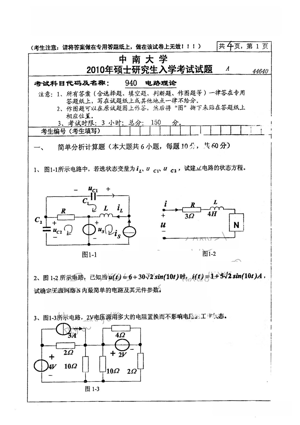 中南大学940电路理论2010年考研真题