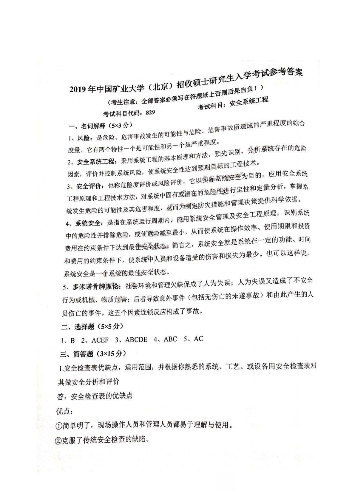 中国矿业大学(北京)829安全系统工程2019年真题答案