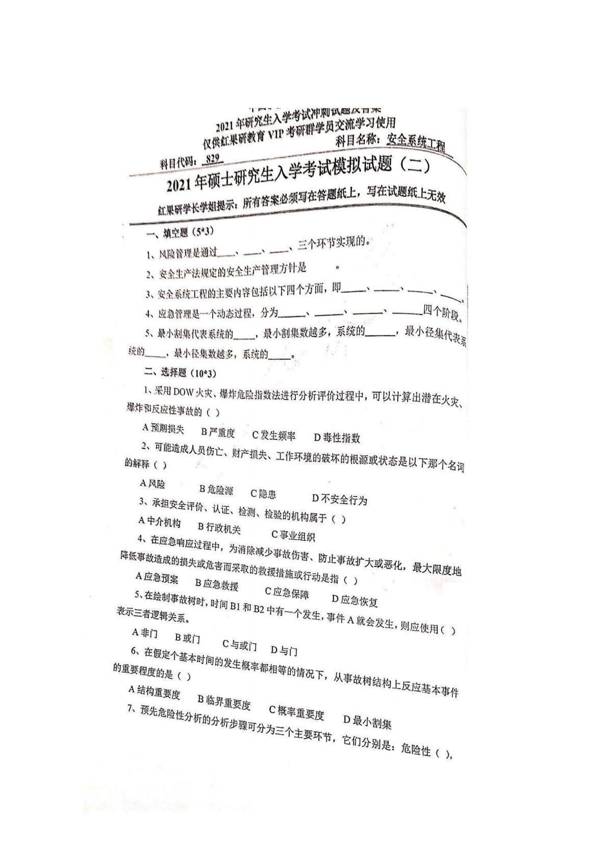 中国矿业大学(北京)829安全系统工程模拟试题二