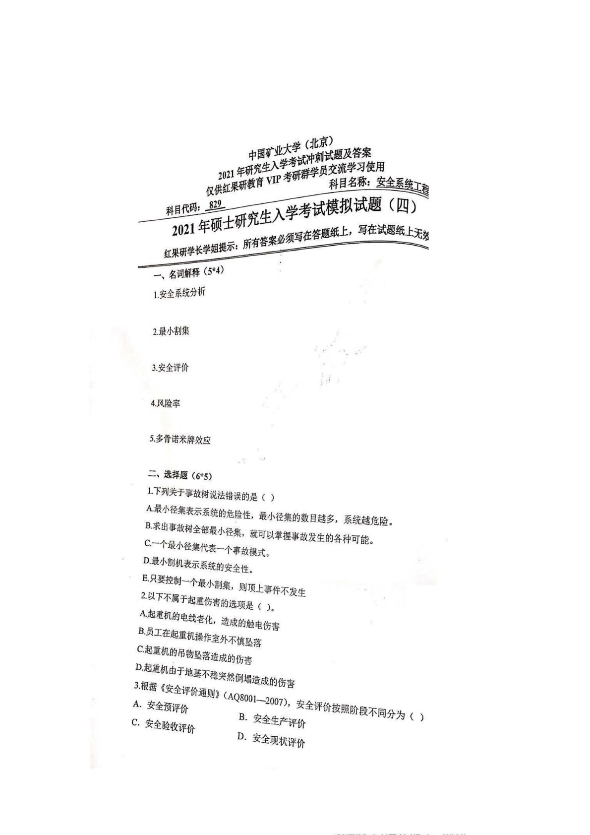 中国矿业大学(北京)829安全系统工程模拟试题四