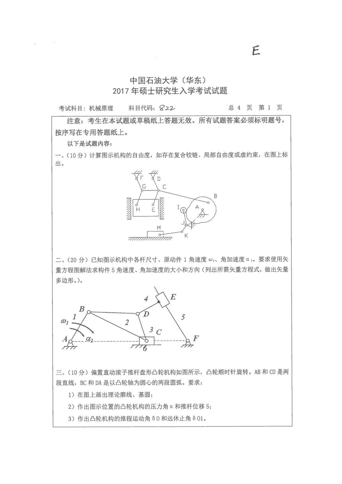 中国石油大学(华东)822机械原理2017年真题