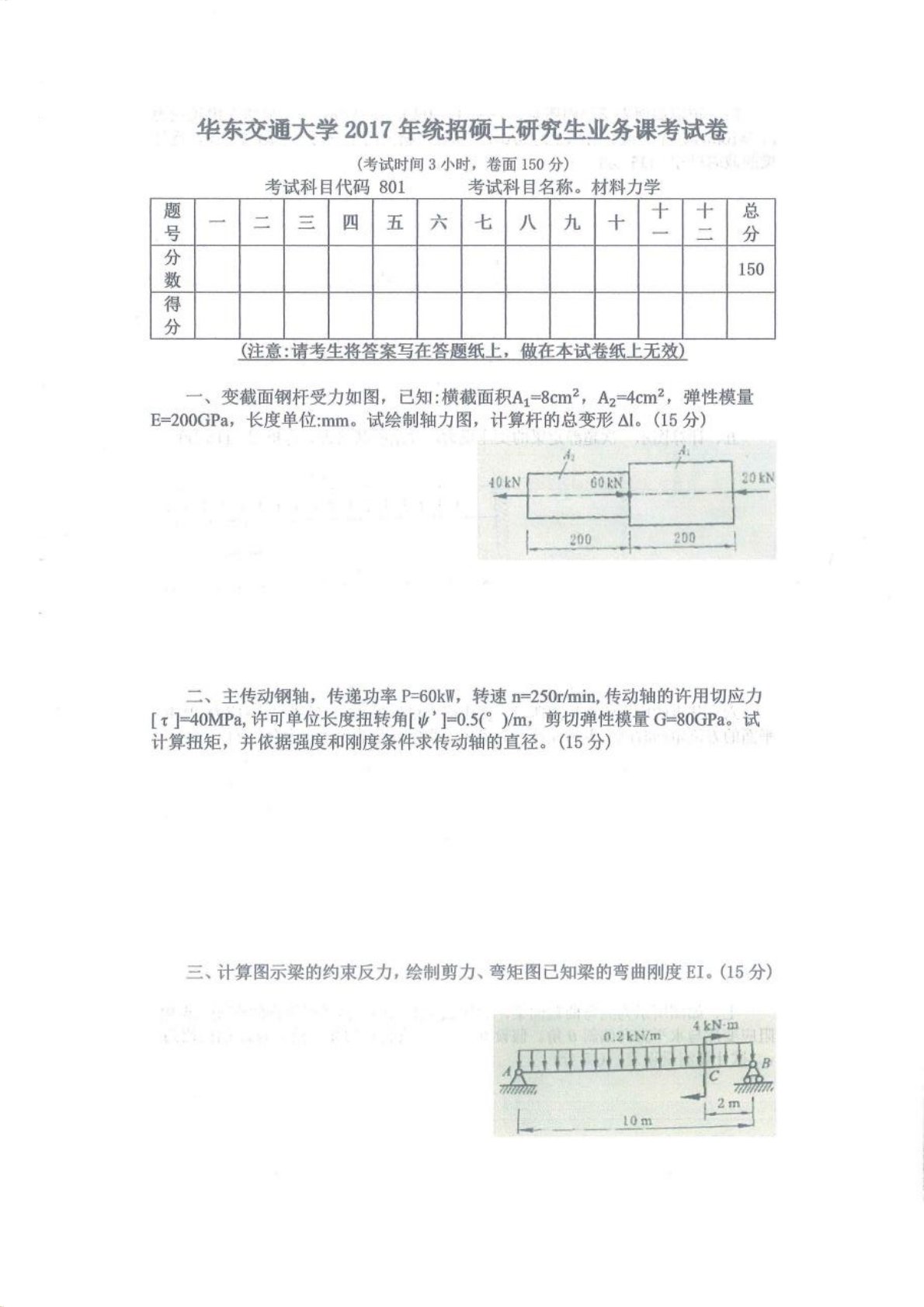 华东交通大学801材料力学2017年真题