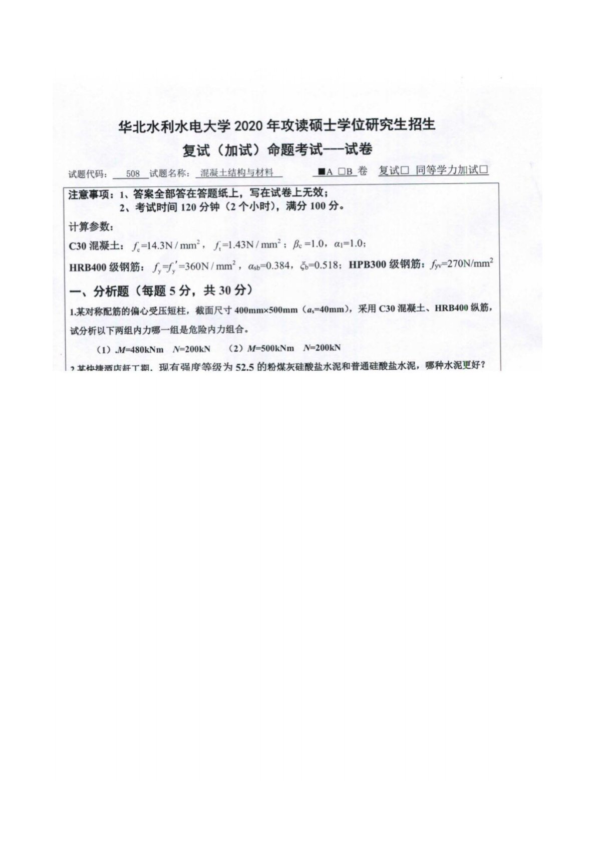 华北水利水电大学508混凝土结构与材料(复试)2020年复试真题