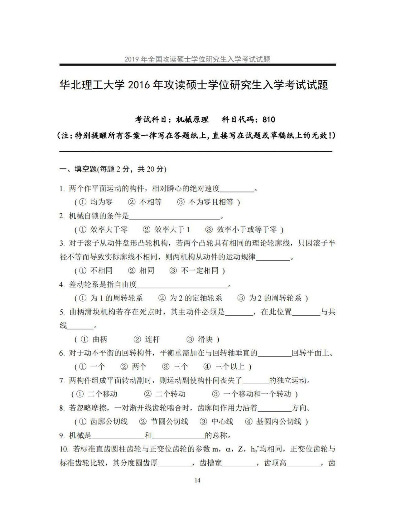 华北理工大学810机械原理2016年真题1