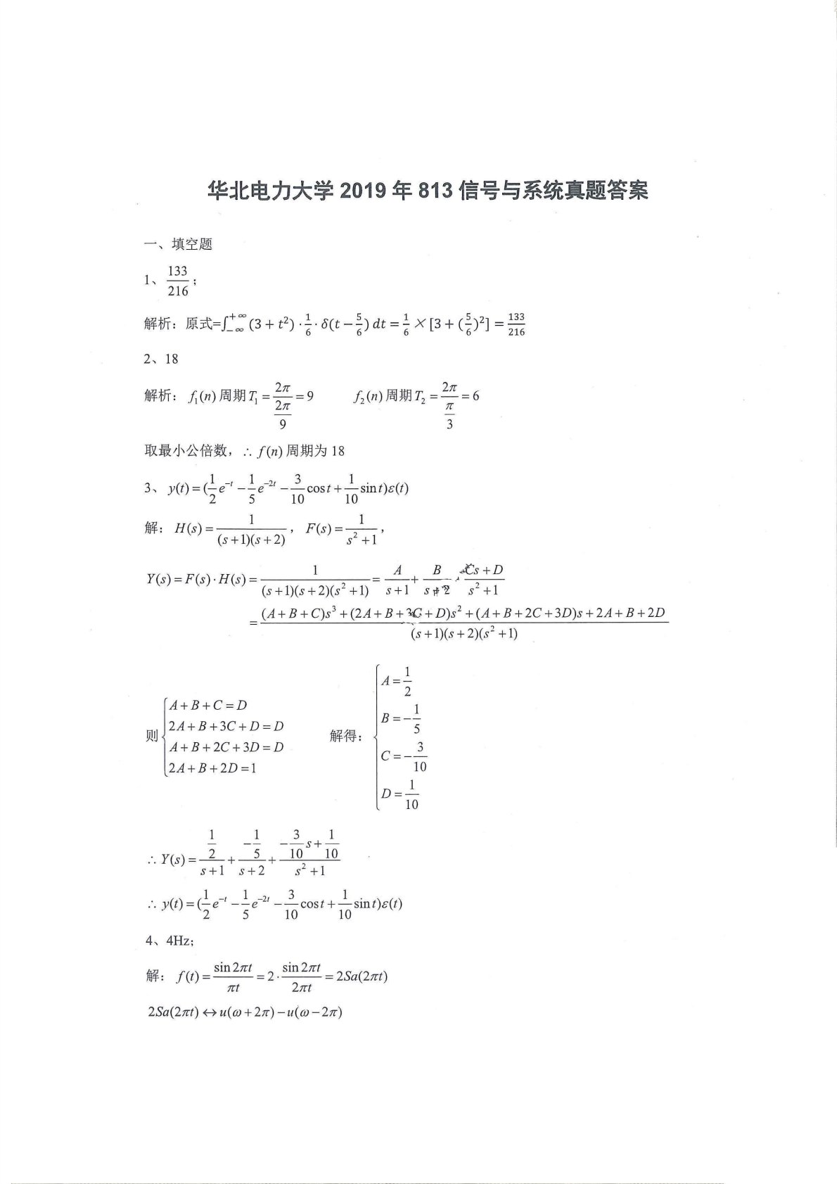 华北电力大学(北京)813信号与系统2019年真题答案