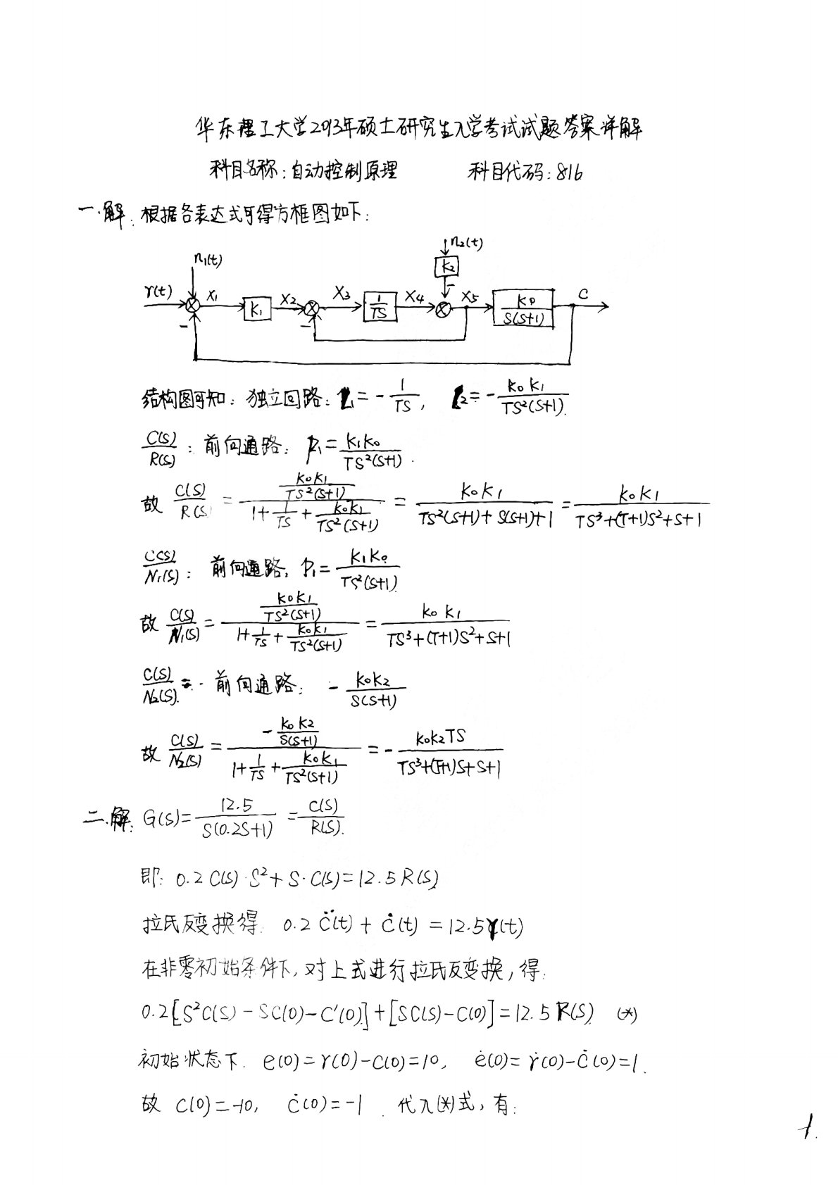 华东理工大学816控制原理2013年考研真题答案