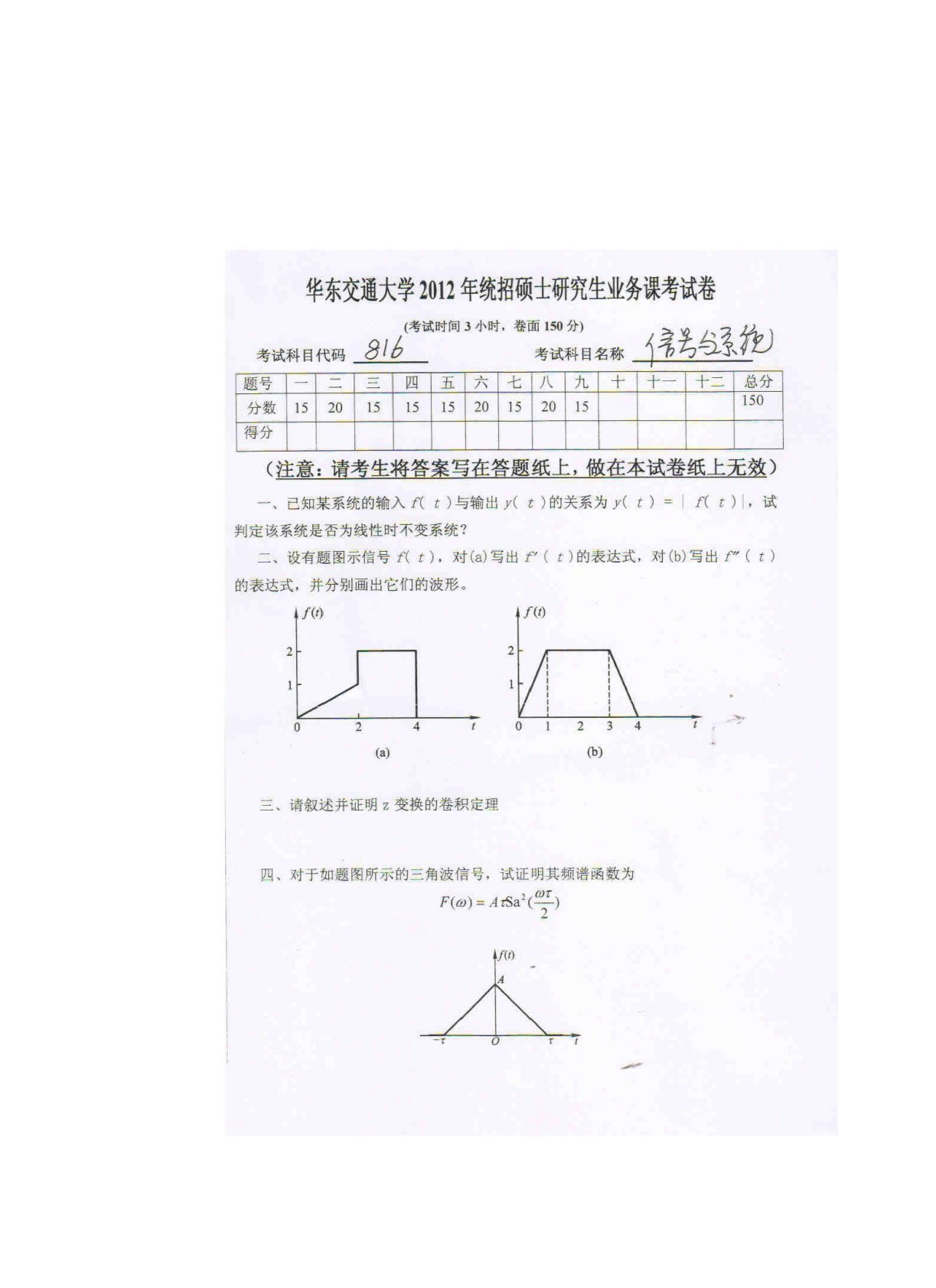 华东交通大学816信号与系统2012年真题