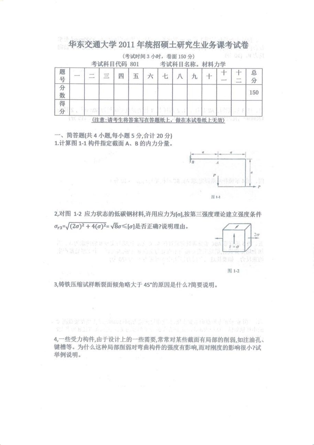 华东交通大学801材料力学2011年真题