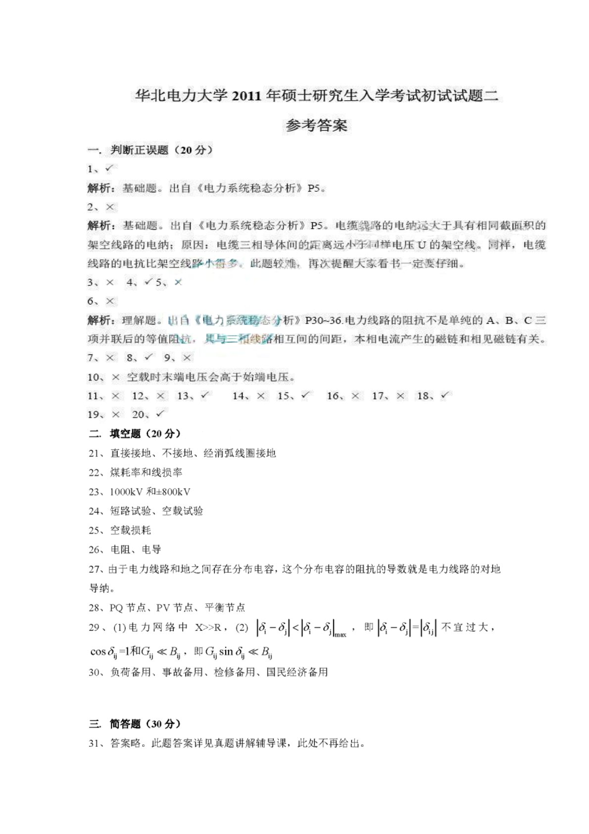 华北电力大学(北京)811电力系统分析基础2011年真题答案