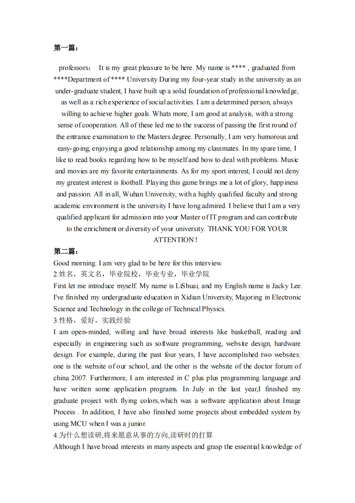 第一篇:professors:Itismygreatpleasuretobehere.Mynameis****,graduatedfrom****Departmentof****University.Duringmyfour-yearstudyintheuniversityasanunder-graduatestudent,Ihavebuiltupasolidfoundationofprofessionalknowledge,aswellasarichexperienceofsocialactivities.Iamadeterminedperson,alwayswillingtoachieve...