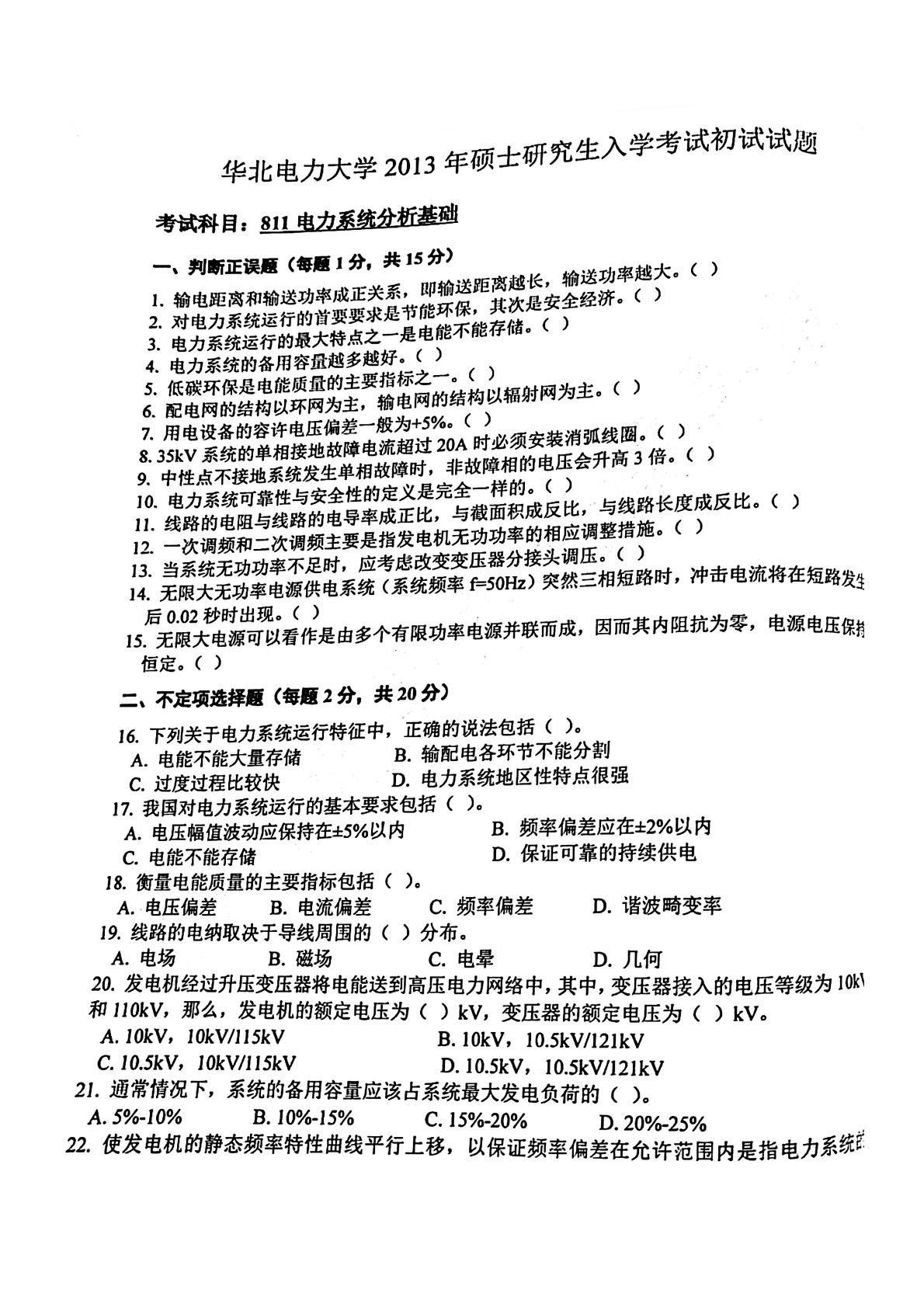 华北电力大学(北京)811电力系统分析基础2013年真题1