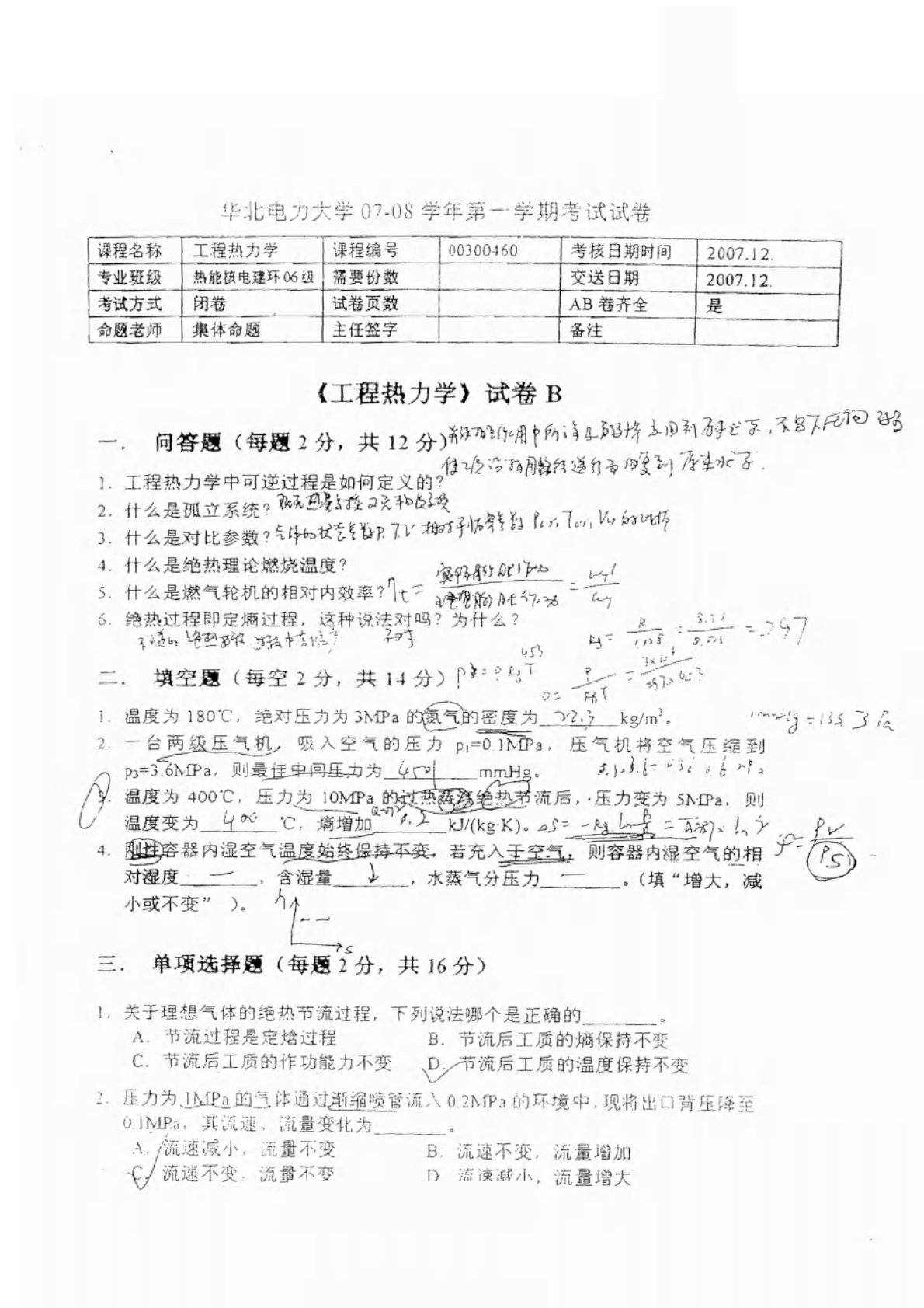 华北电力大学(北京)823热工基础2007-2008年第一学期期末试卷B