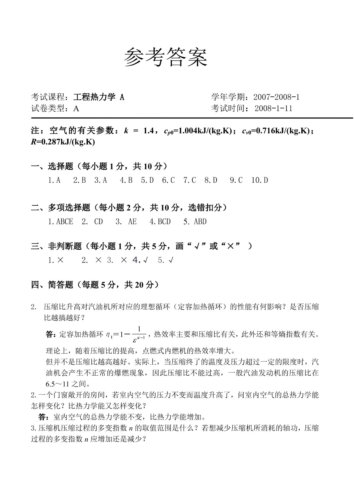 华北电力大学(北京)823热工基础2007-2008年第一学期期末试卷A1答案解析