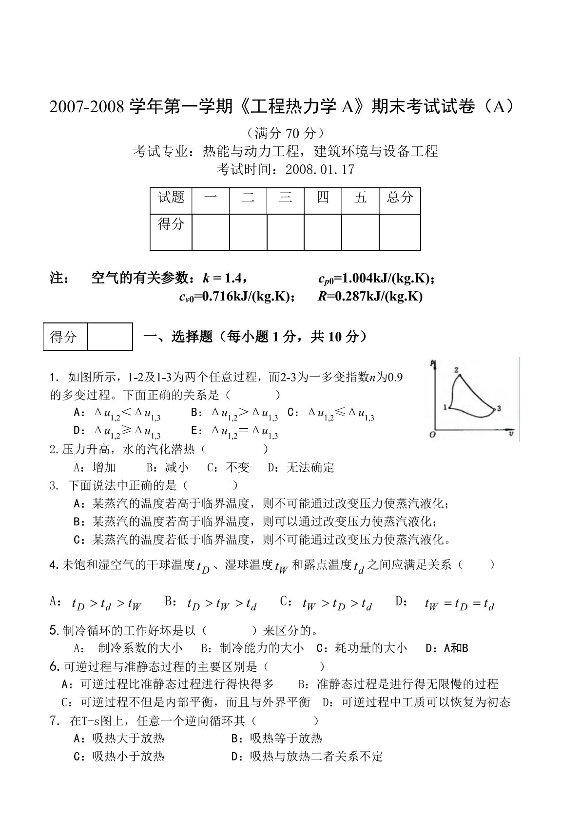华北电力大学(北京)823热工基础2007-2008年第一学期期末试卷A1