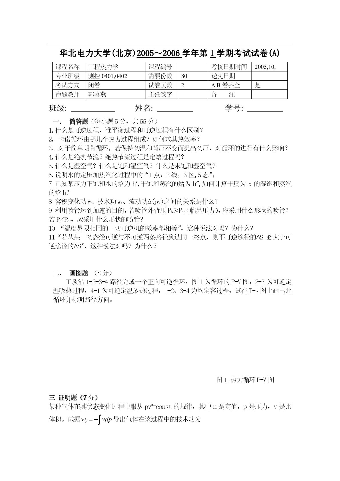 华北电力大学(北京)823热工基础2005-2006年热力学第一学期期末试卷A