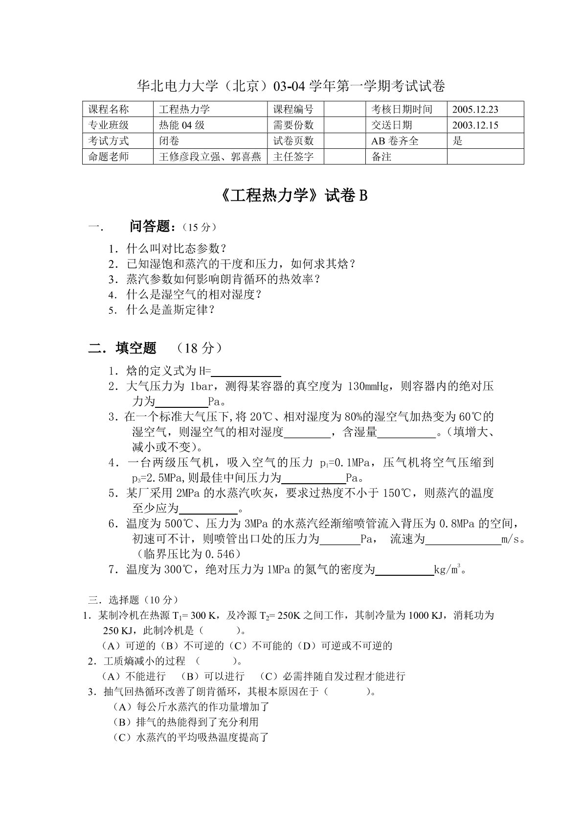华北电力大学(北京)823热工基础2003-2004年第一学期期末试卷B