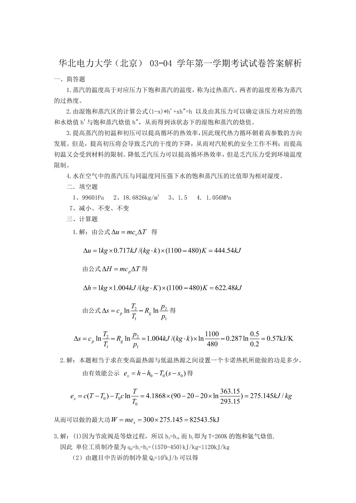 华北电力大学(北京)823热工基础2003-2004年第一学期期末试卷A答案解析