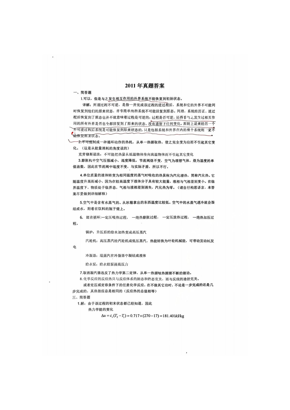 华北电力大学(北京)823热工基础(工程热力学)2011年真题答案