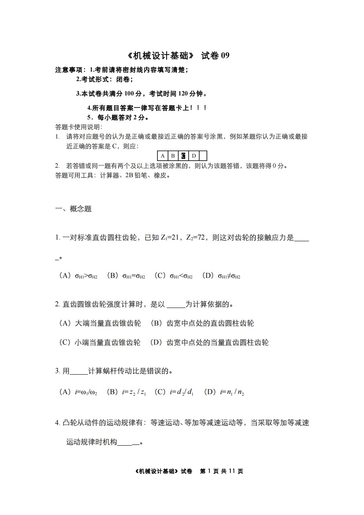 《机械设计基础》试卷09注意事项:1.考前请将密封线内容填写清楚;2.考试形式:闭卷;3.本试卷共满分100分,考试时间120分钟。4.所有题目答案一律写在答题卡上!!!5.每小题答对2分。答题卡使用说明:1.请将对应题号的认为是正确或最接近正确的答案号涂黑,例如某题你认为正确或最接近正确的答案是C,则应:ABCD2.若答错或同一题有两个及以上选项被涂黑的,则认为该题答错,该题将得0分。答题可用工具:计算器、2B铅笔、橡皮。一、概念题1.一对标准直齿圆柱齿轮,已知Z1=21,Z2=72,则这对齿轮的接触应力是_____。(A)σH1>σH2(B)σH1=σH2(C)σH1