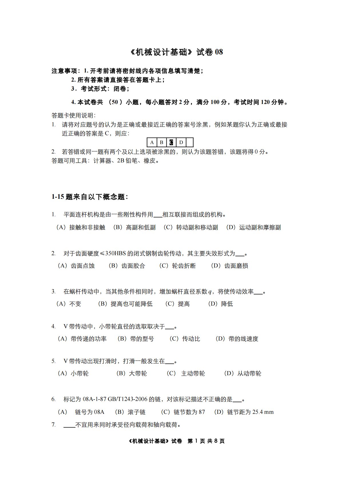 《机械设计基础》试卷08注意事项:1.开考前请将密封线内各项信息填写清楚;2.所有答案请直接答在答题卡上;3.考试形式:闭卷;4.本试卷共(50)小题,每小题答对2分,满分100分,考试时间120分钟。答题卡使用说明:1.请将对应题号的认为是正确或最接近正确的答案号涂黑,例如某题你认为正确或最接近正确的答案是C,则应:ABCD2.若答错或同一题有两个及以上选项被涂黑的,则认为该题答错,该题将得0分。答题可用工具:计算器、2B铅笔、橡皮。1-15题来自以下概念题:1.平面连杆机构是由一些刚性构件用相互联接而组成的机构。(A)接触和非接触(B)高副和低副(C)转动副和移动副(D)运动副和摩擦副2....