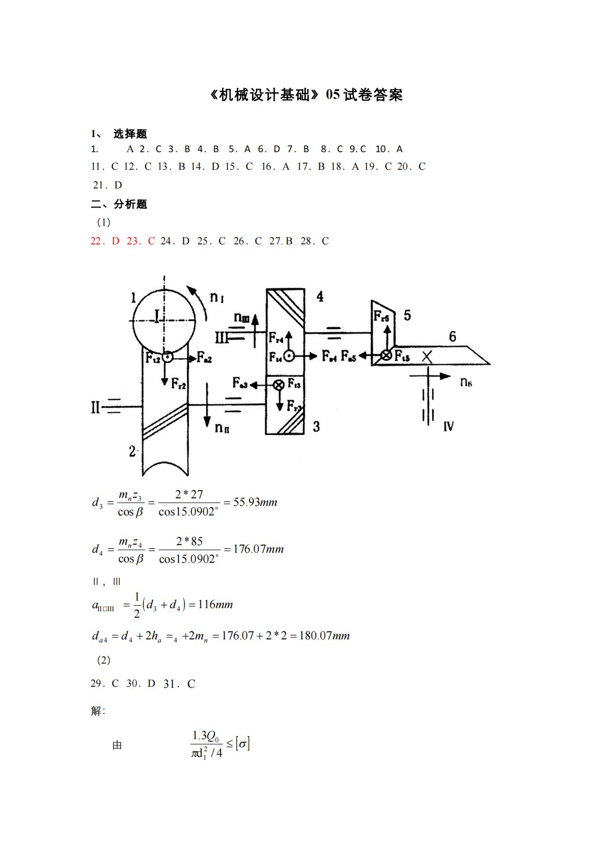 《机械设计基础》05试卷答案1、选择题1.A2.C3.B4.B5.A6.D7.B8.C9.C10.A11.C12.C13.B14.D15.C16.A17.B18.A19.C20.C21.D二、分析题(1)22.D23.C24.D25.C26.C27.B28.Cmmzmdn93.550902.15cos27*2cos33mmzmdn07.1760902.15cos85*2cos44Ⅱ,Ⅲmmdda1162143Ⅱ,Ⅲmmmhddnaa07.1802*207.17622444(2)29.C30.D31.C解:由4/d3.1210Q得3.14][...