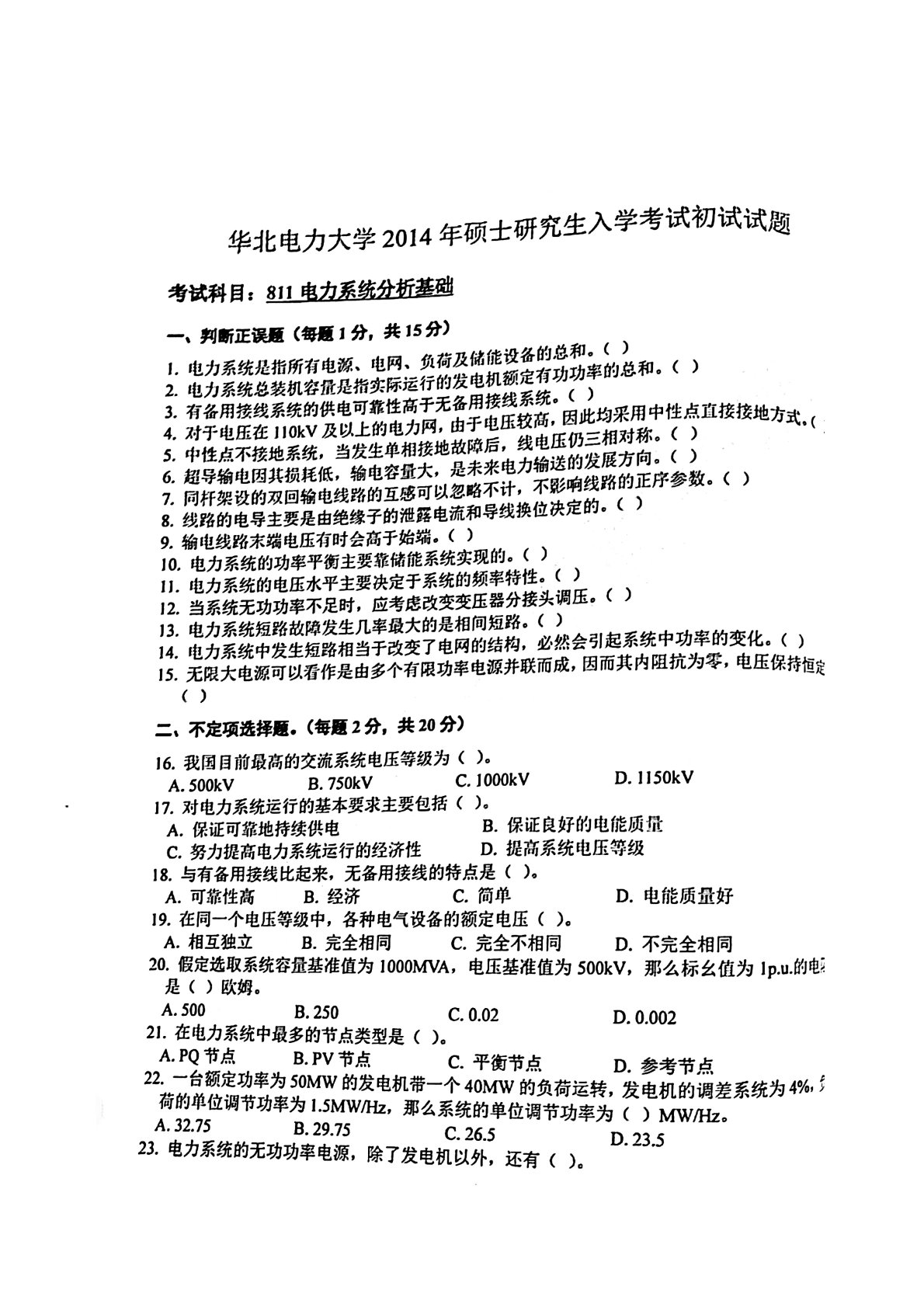 华北电力大学(北京)811电力系统分析基础2014年真题1