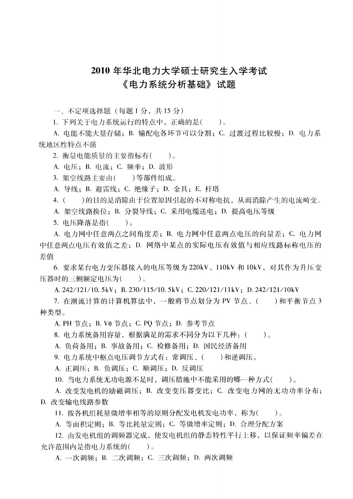 华北电力大学(北京)811电力系统分析基础2010年真题1