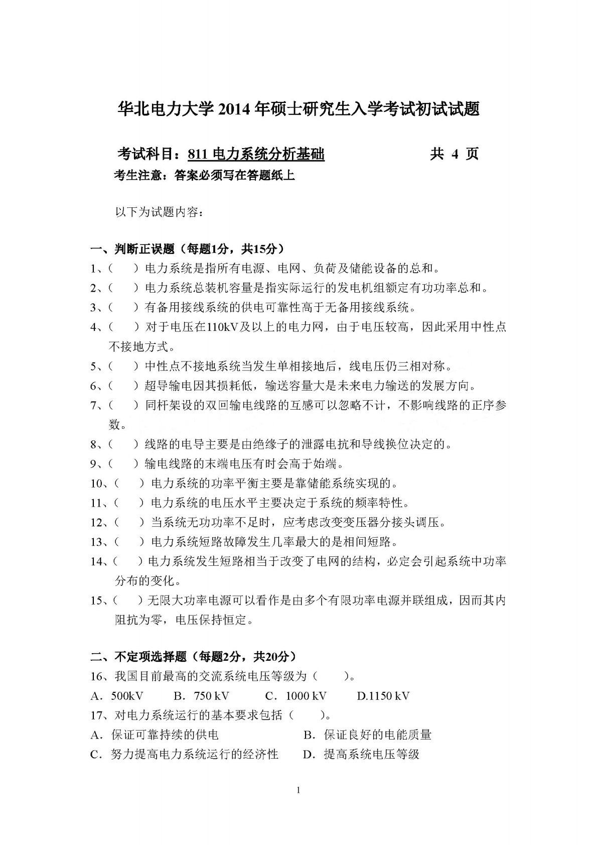 华北电力大学(北京)811电力系统分析基础2014年真题