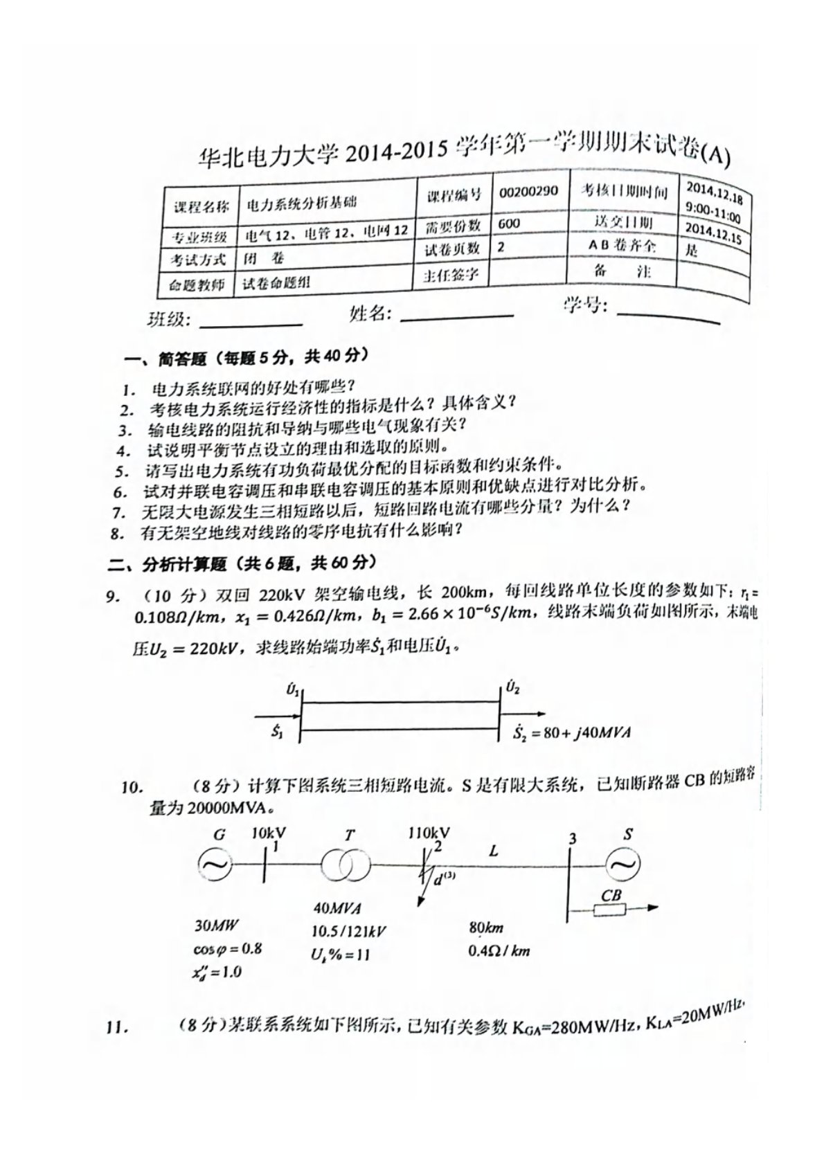 华北电力大学(北京)811电力系统分析基础2014年-2015年期末试卷