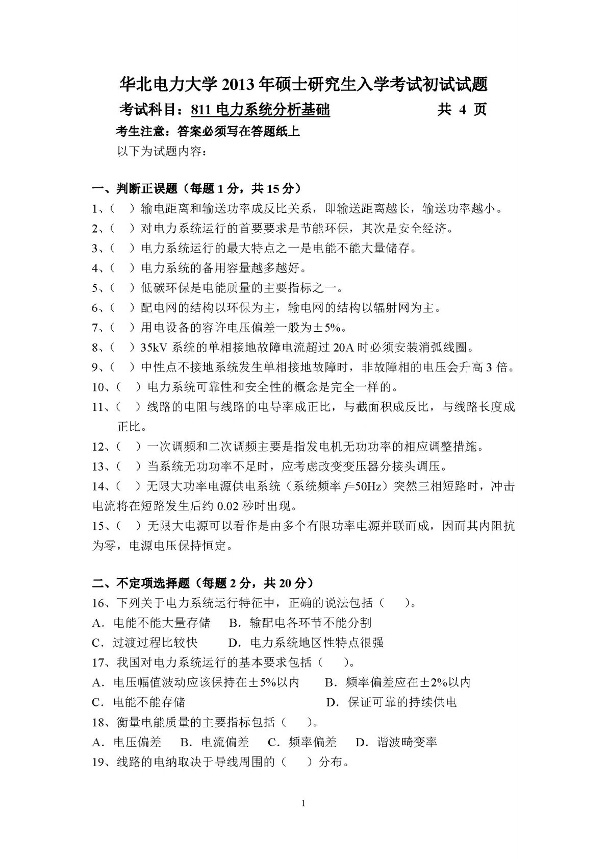 华北电力大学(北京)811电力系统分析基础2013年真题