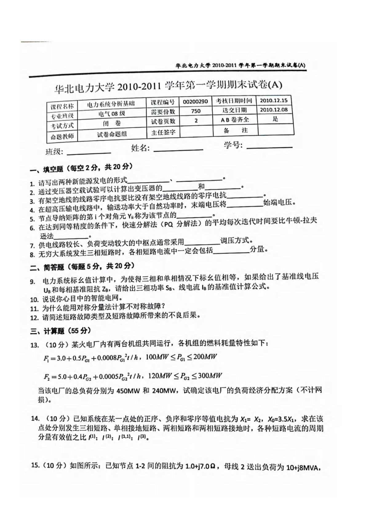 华北电力大学(北京)811电力系统分析基础2010年-2011年期末试卷