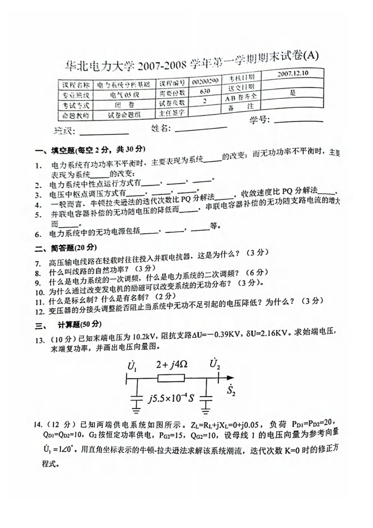 华北电力大学(北京)811电力系统分析基础2007年-2008年期末试卷A