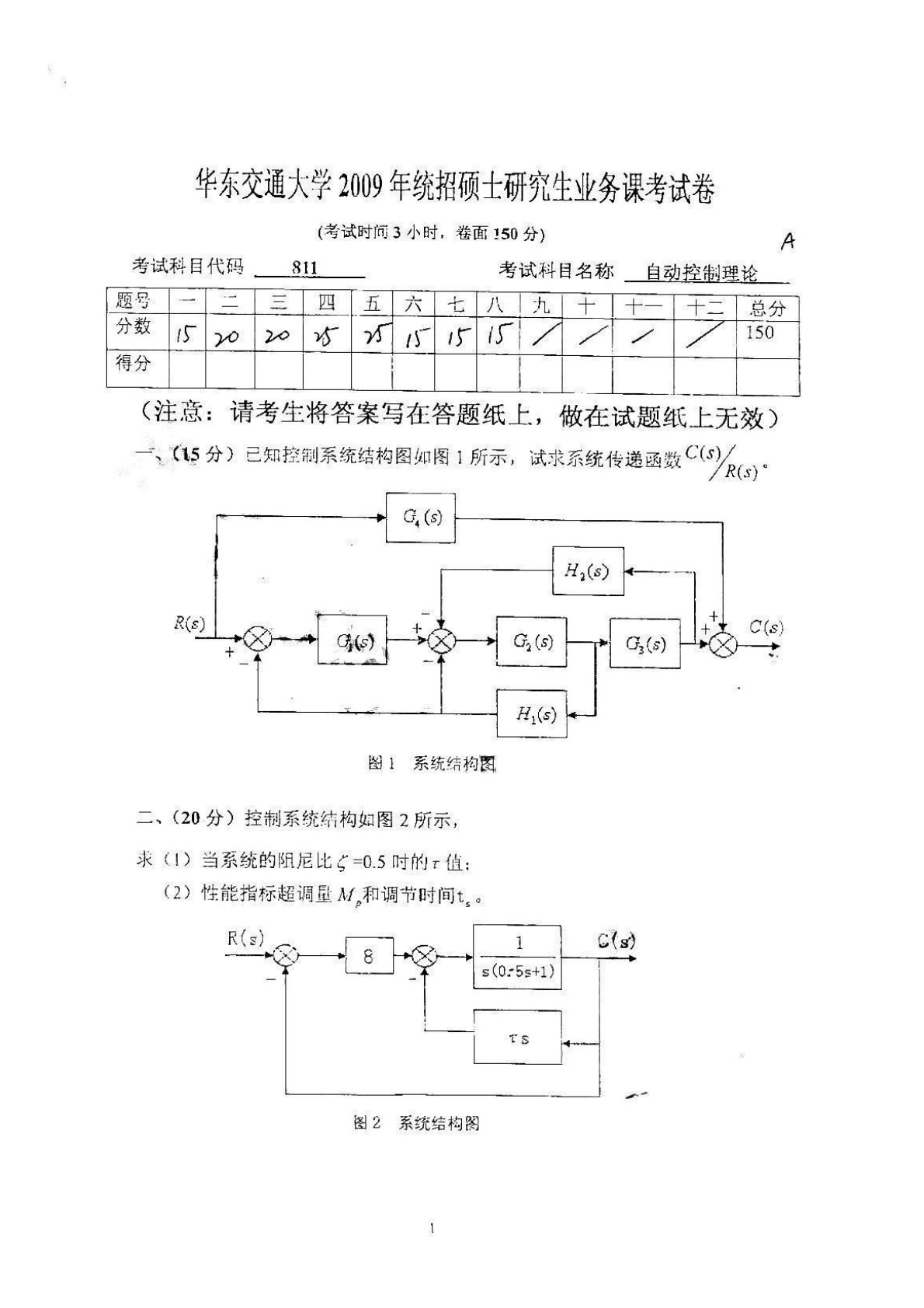 华东交通大学811自动控制理论2009年真题