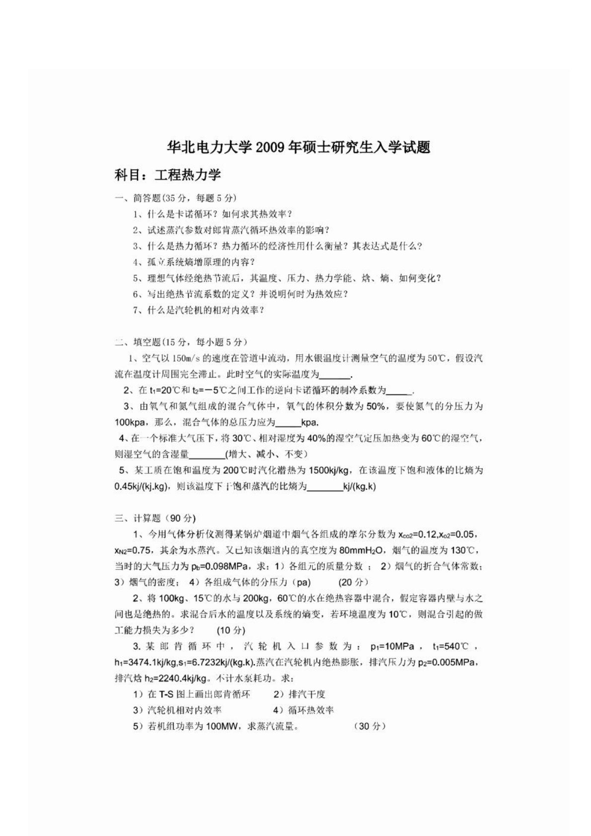 华北电力大学(北京)823热工基础2009年考研真题
