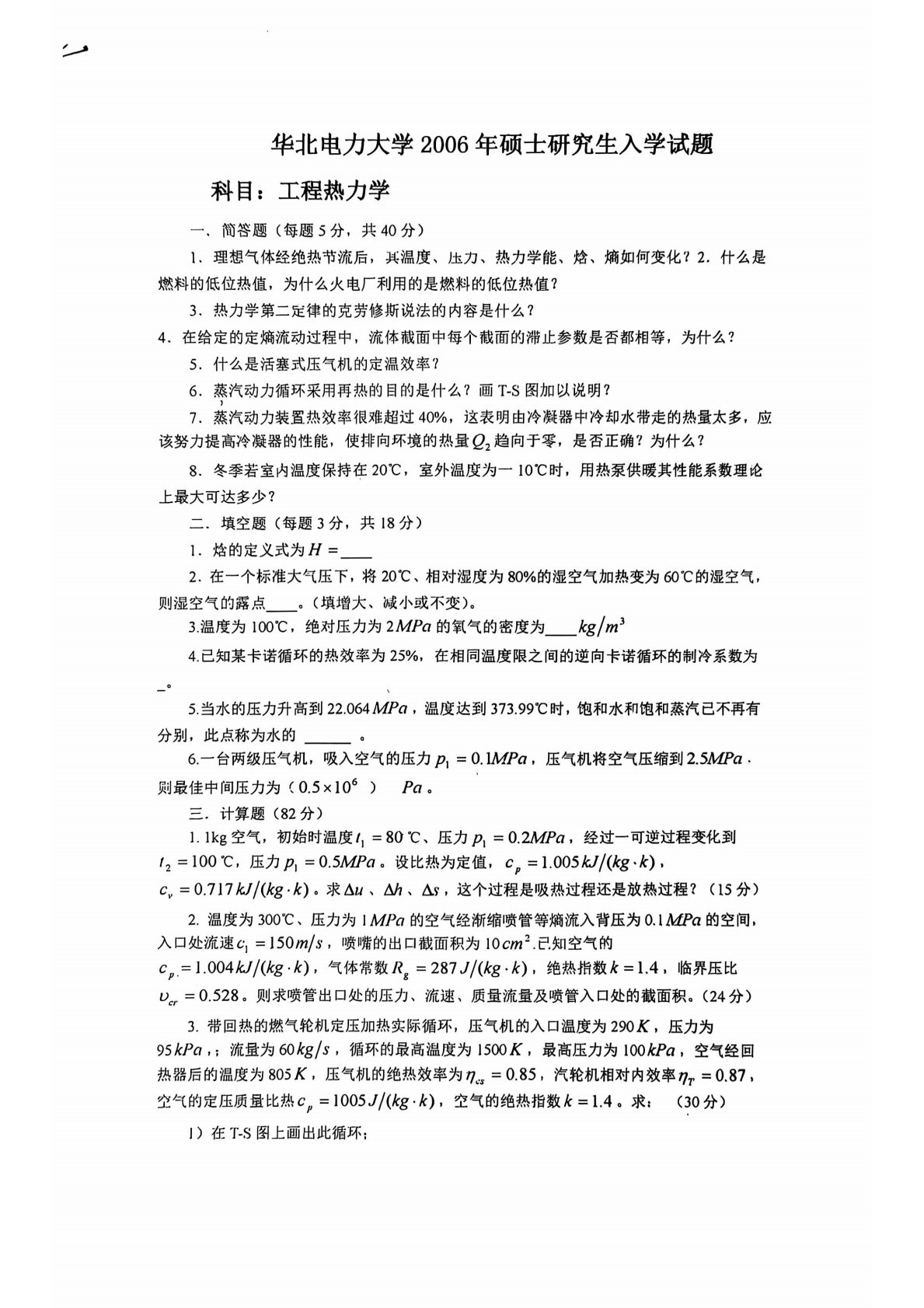 华北电力大学(北京)823热工基础(工程热力学)2006年真题