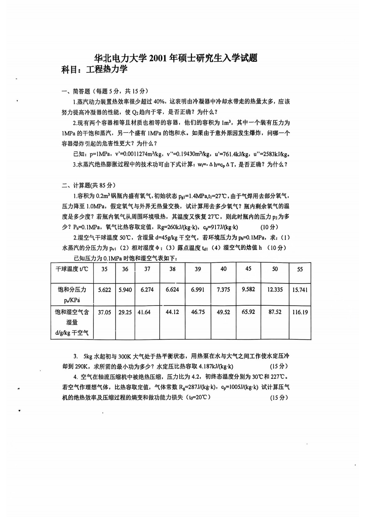 华北电力大学(北京)823热工基础(工程热力学)2001年真题