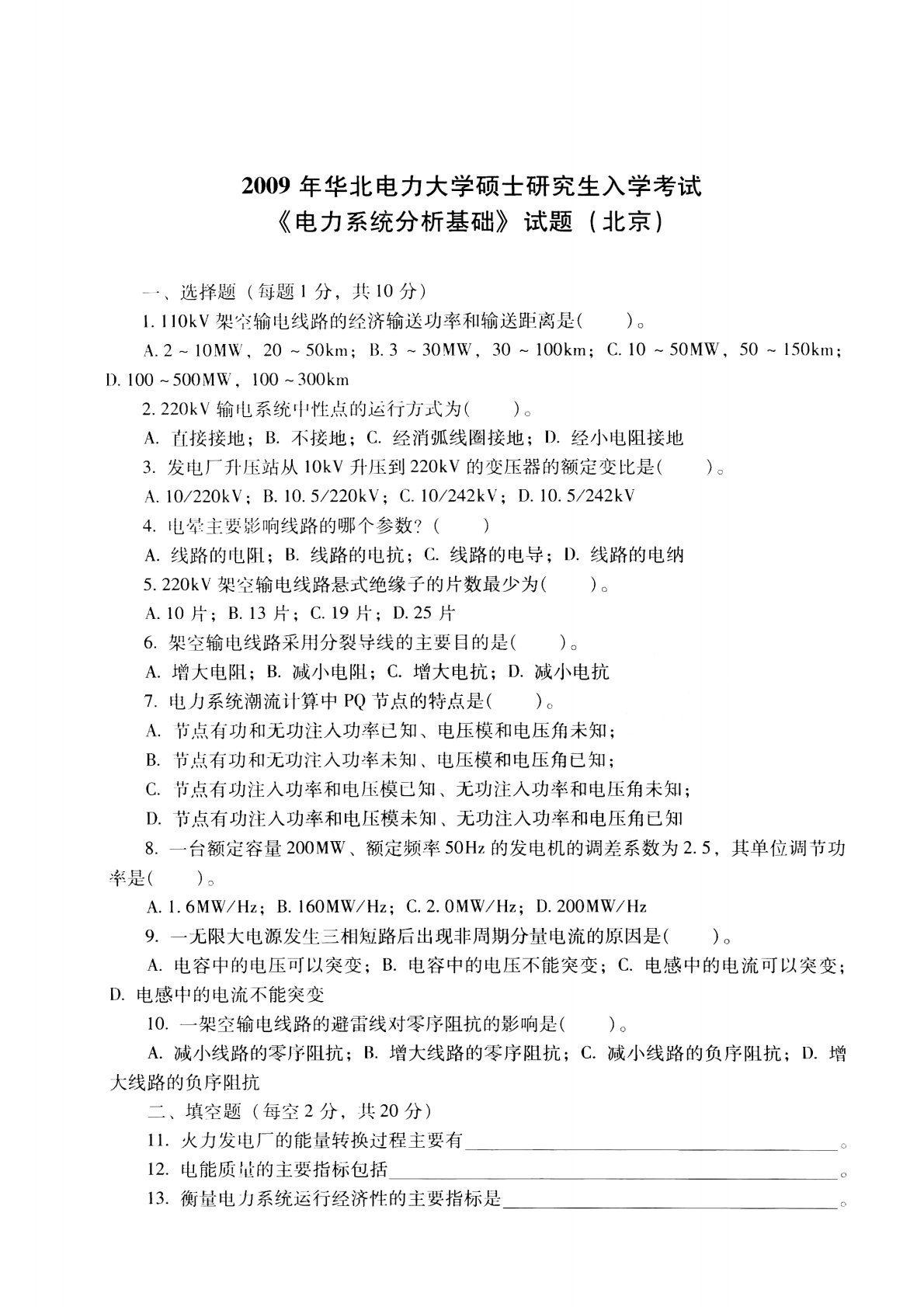 华北电力大学(北京)811电力系统分析基础2009年真题