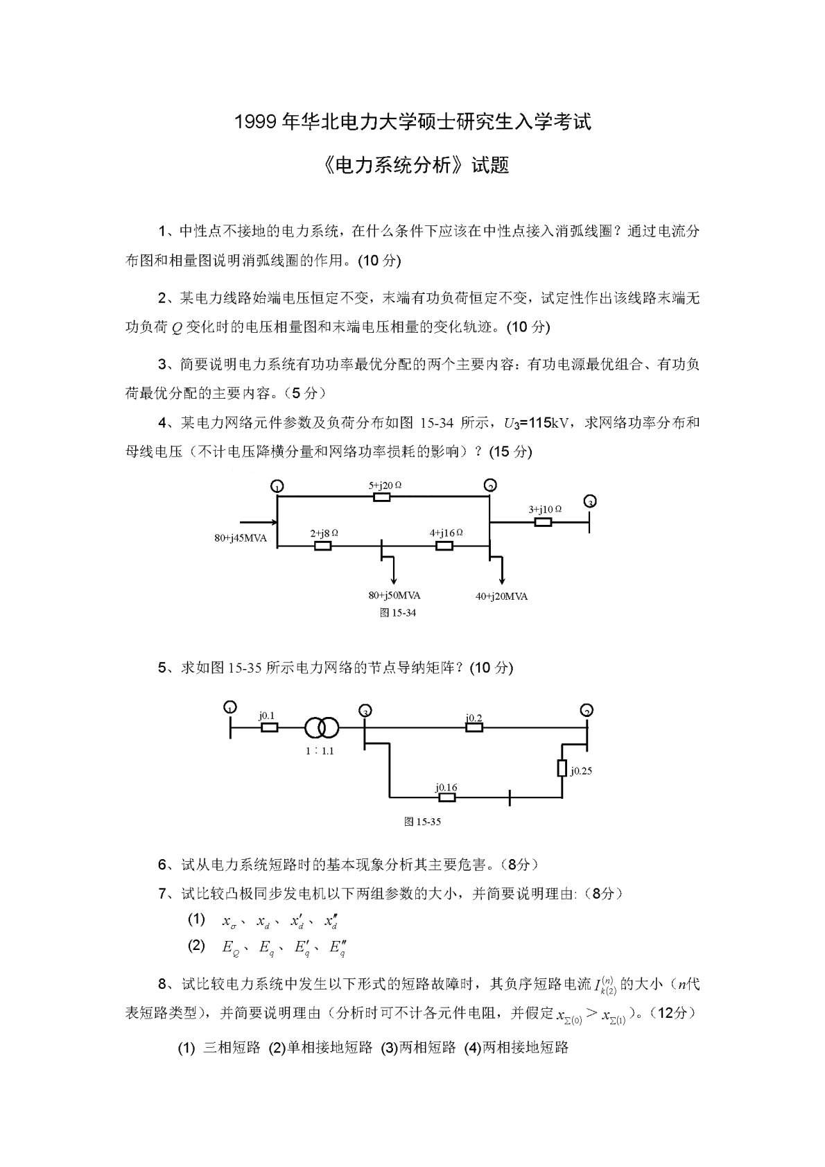 华北电力大学(北京)811电力系统分析基础1999年真题