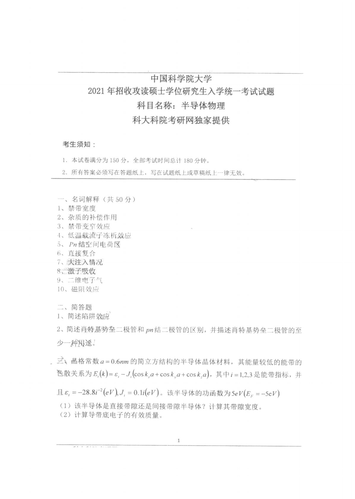 中国科学院大学804半导体物理2021年真题