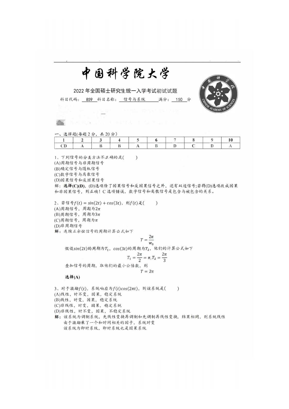 中国科学院大学859信号与系统2022年真题答案