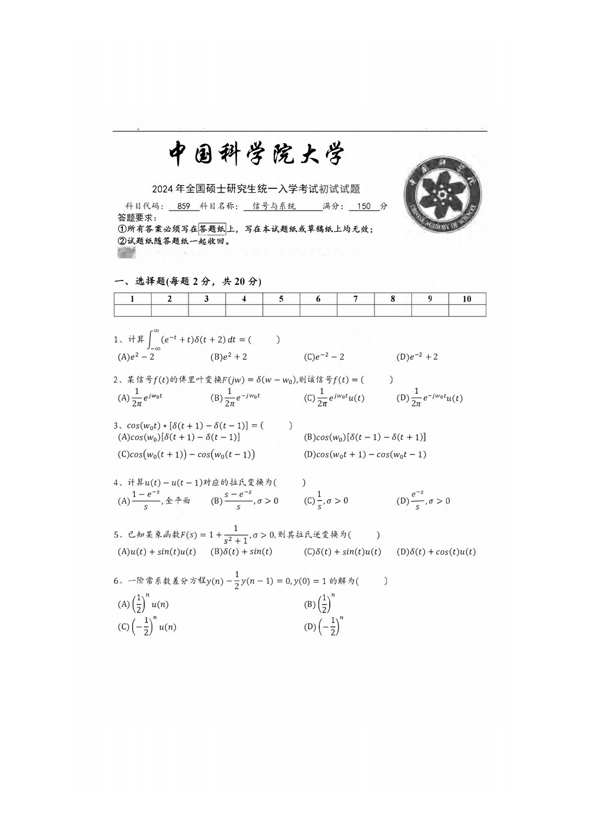 中国科学院大学859信号与系统2024年真题