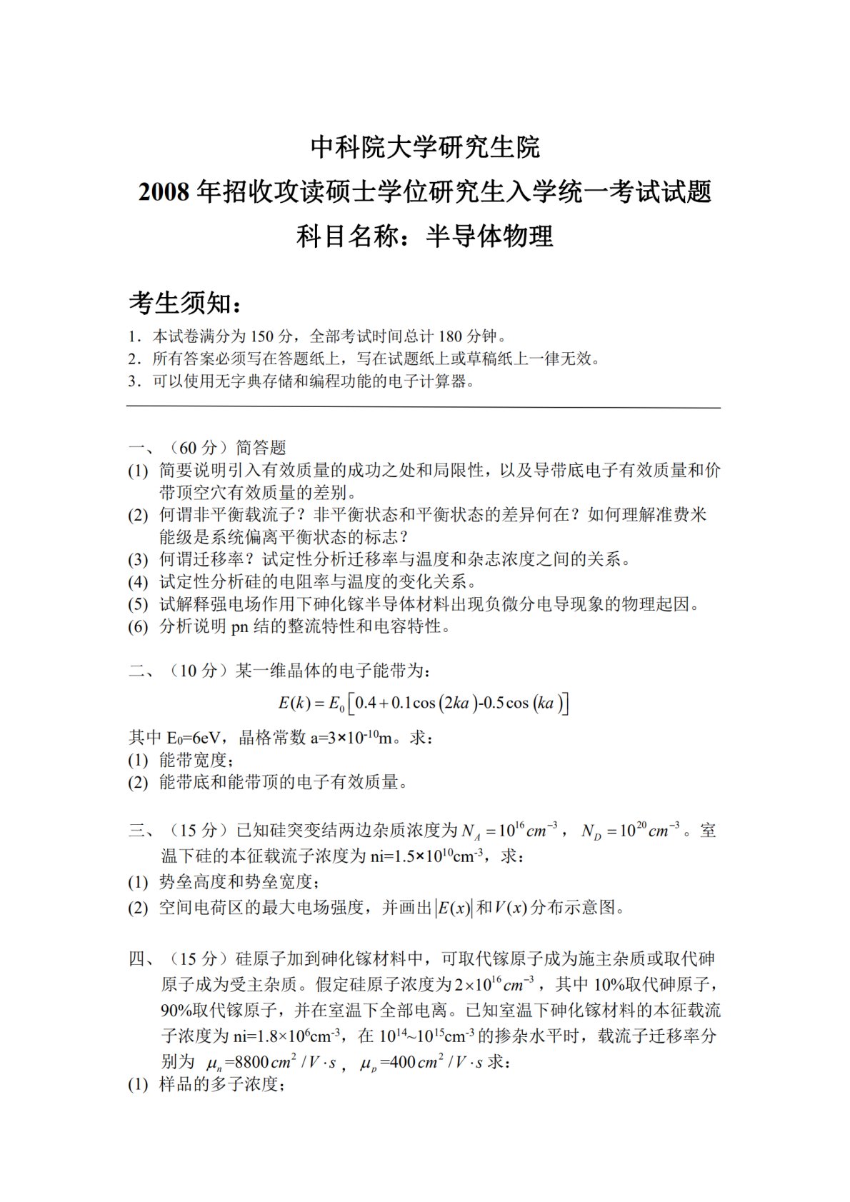 中国科学院大学804半导体物理考研2008年真题