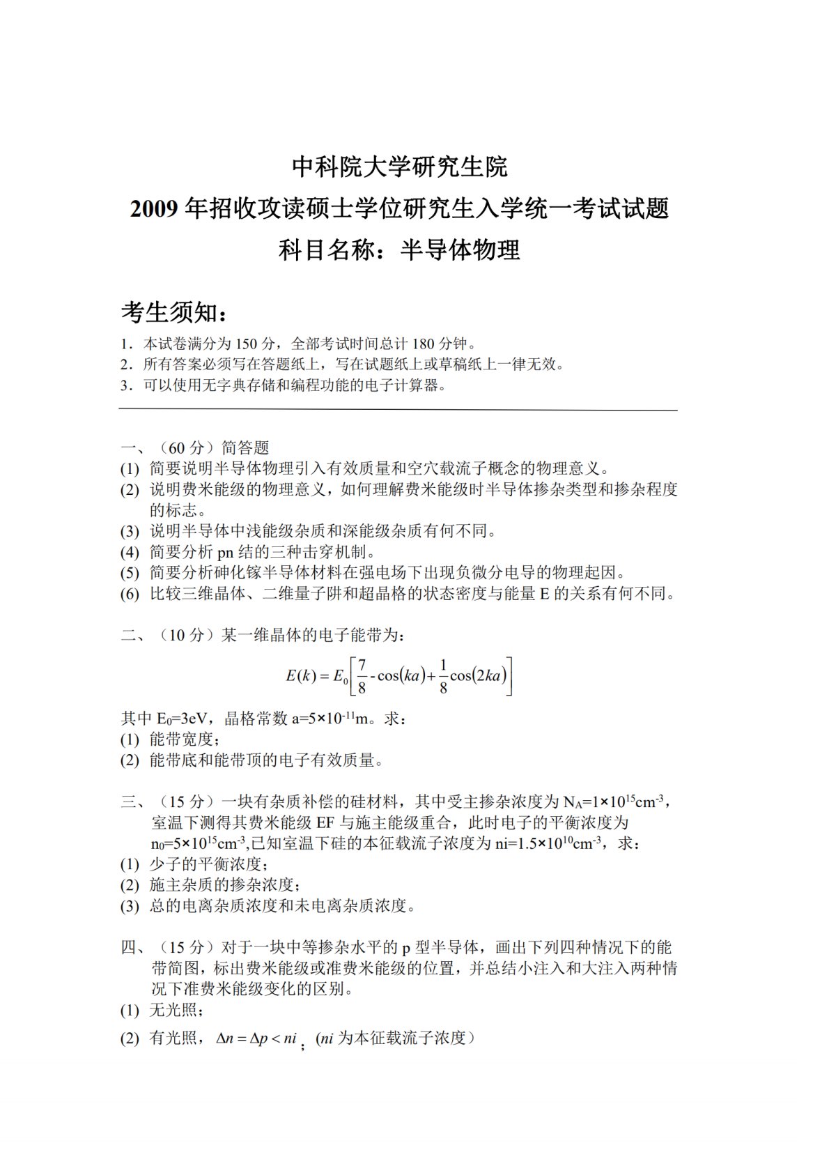 中国科学院大学804半导体物理考研2009年真题