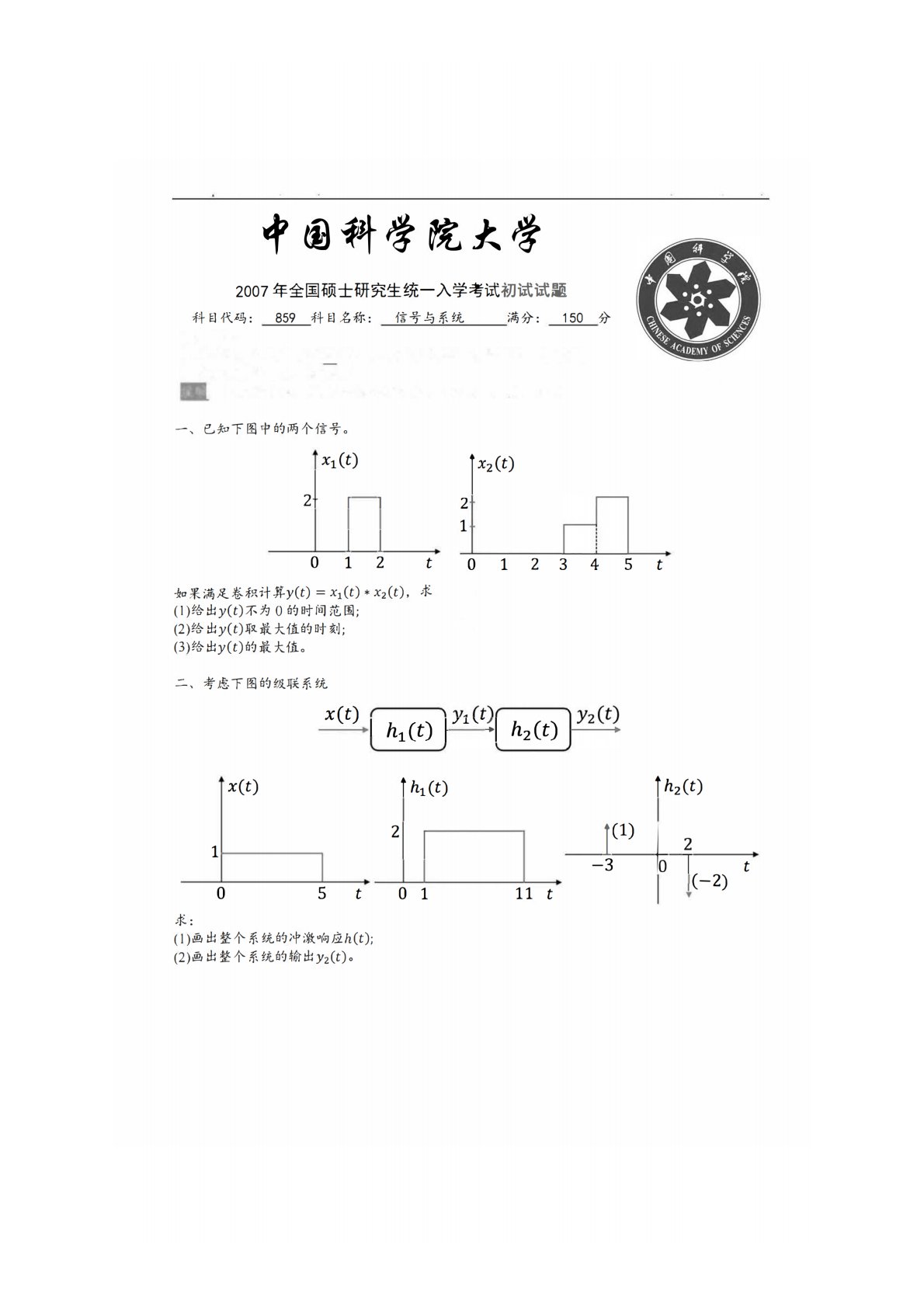 中国科学院大学859信号与系统2007年真题