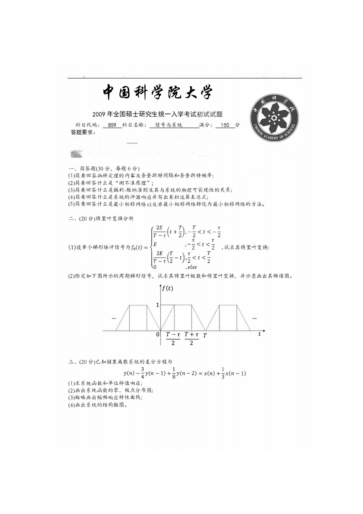 中国科学院大学859信号与系统2009年真题