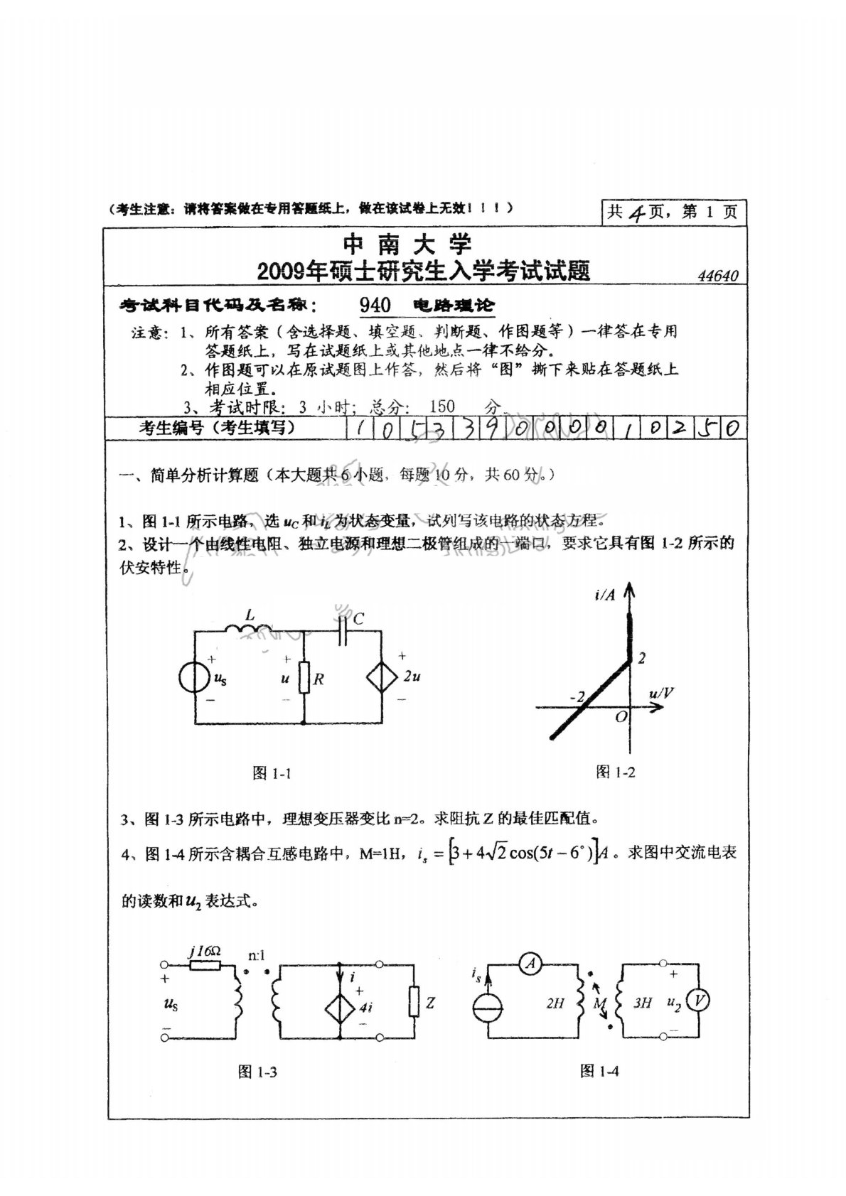 中南大学940电路理论2009年考研真题