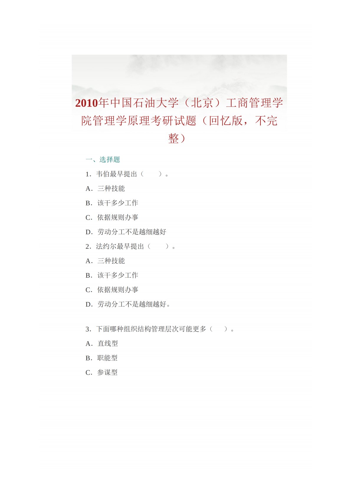 中国石油大学(北京)875管理学(学硕)2010年真题回忆版