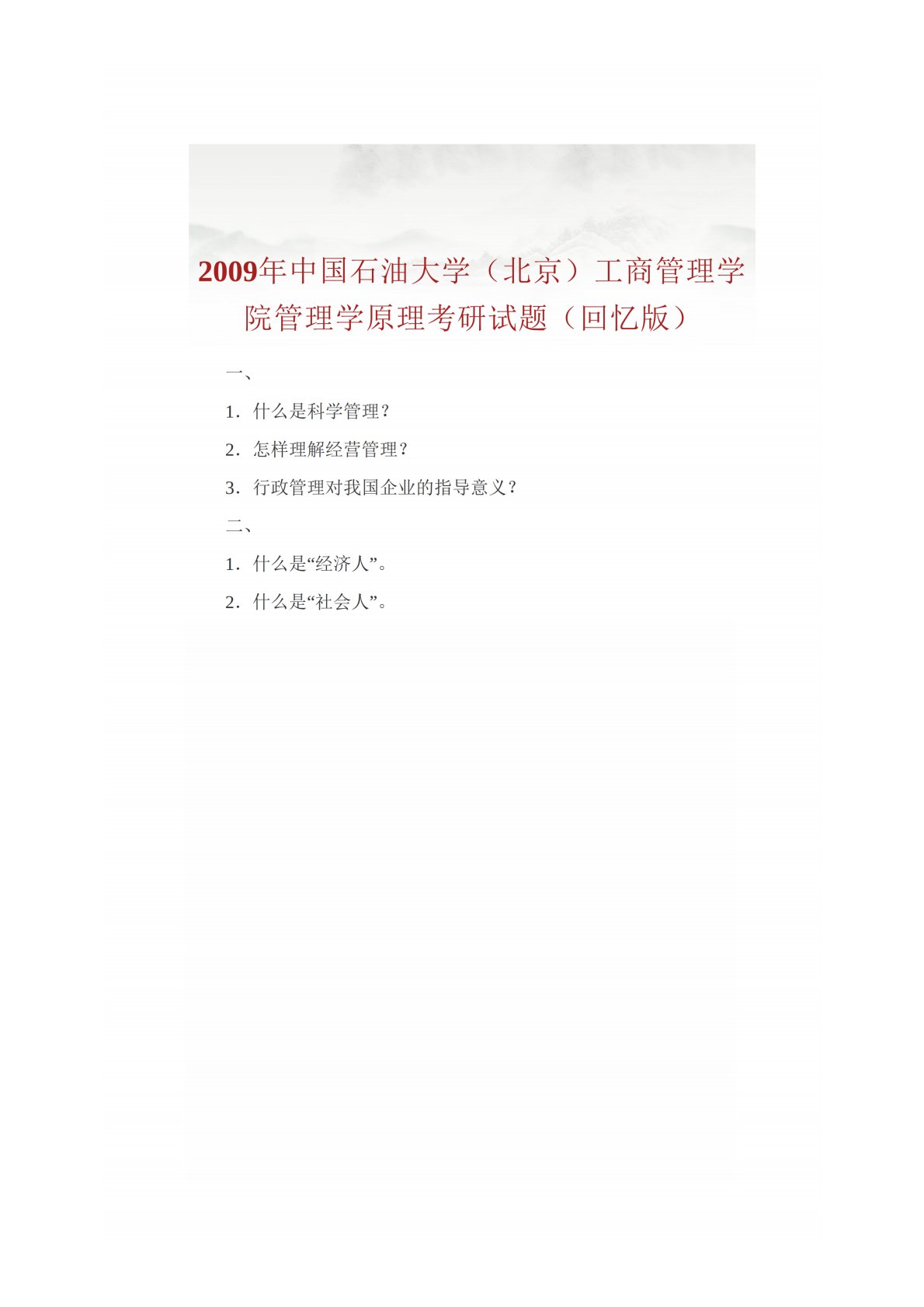中国石油大学(北京)875管理学(学硕)2009年真题回忆版