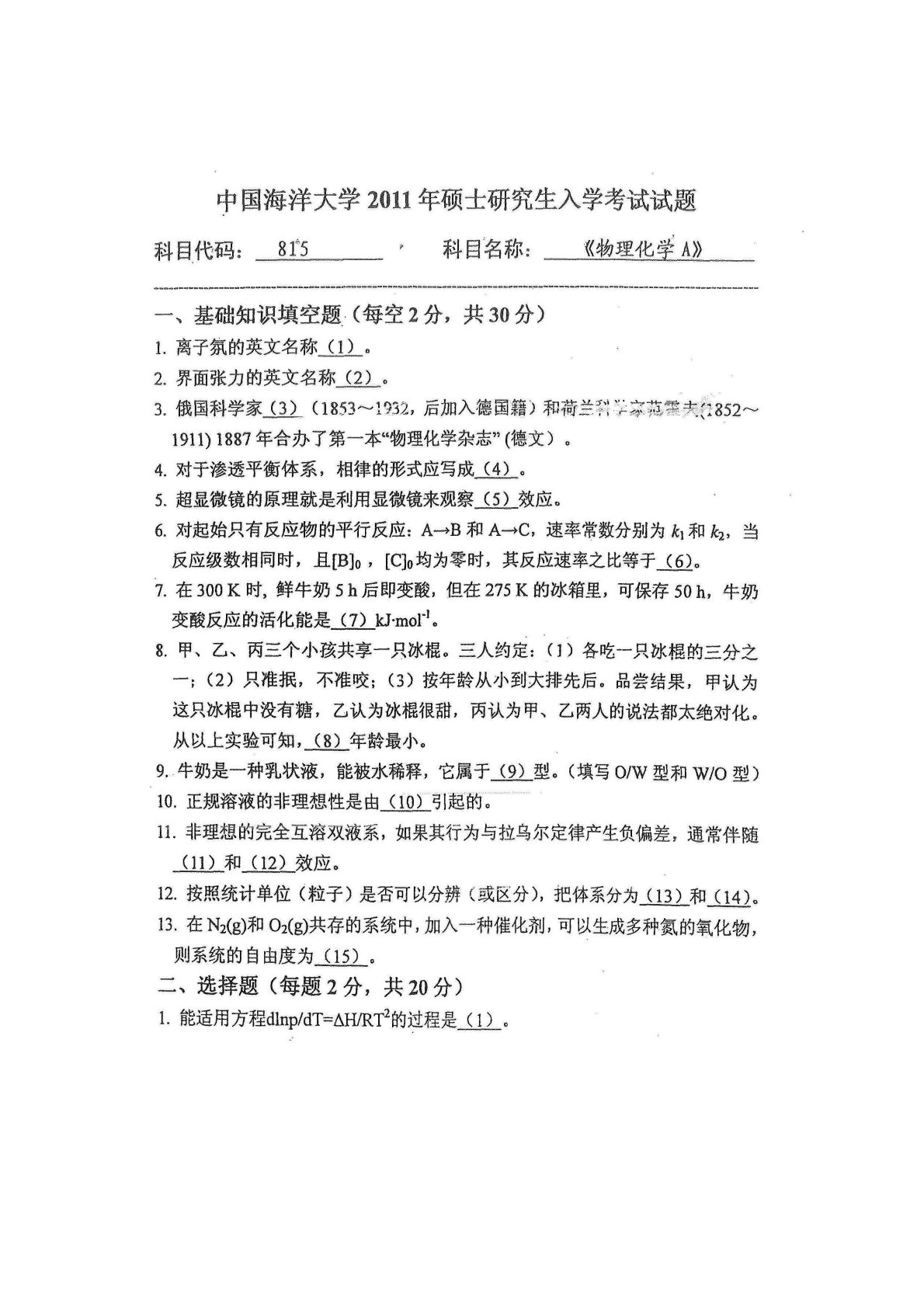 中国海洋大学815物理化学A2011年真题
