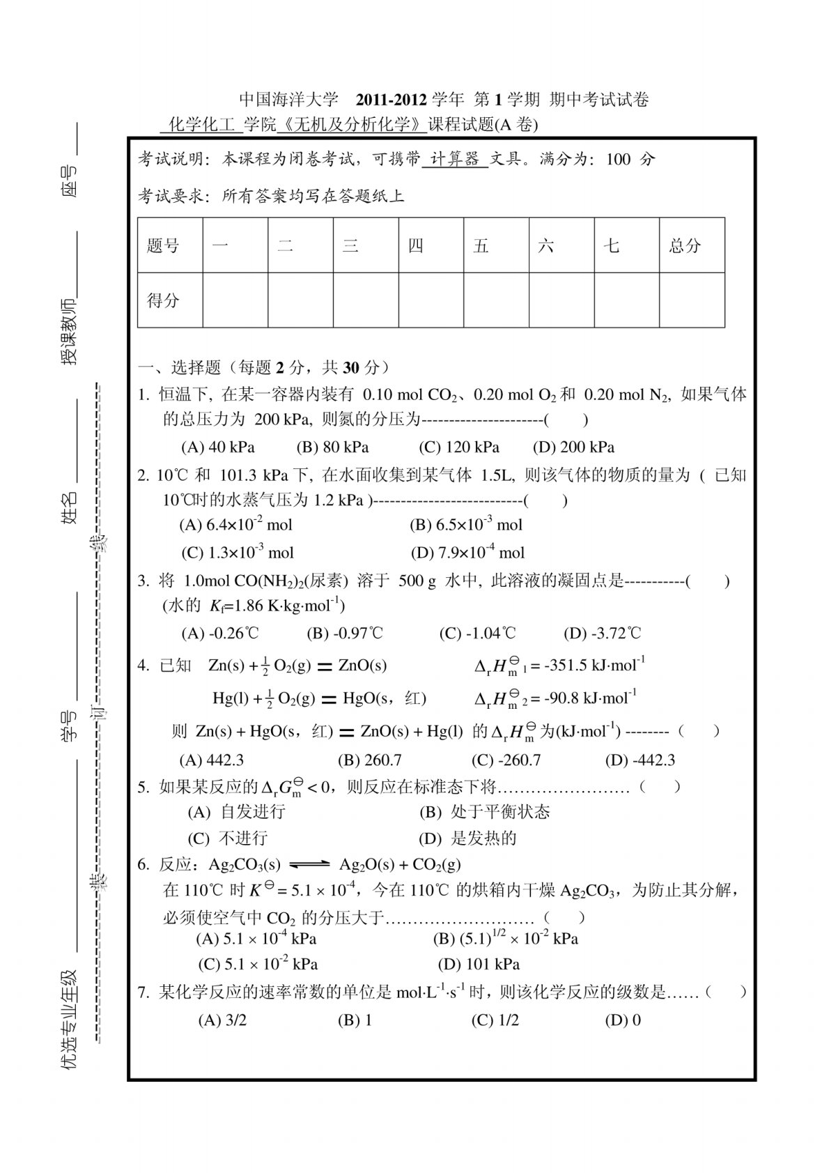 中国海洋大学F1001化学与生物学2011-2012年第1学期期中考试试题